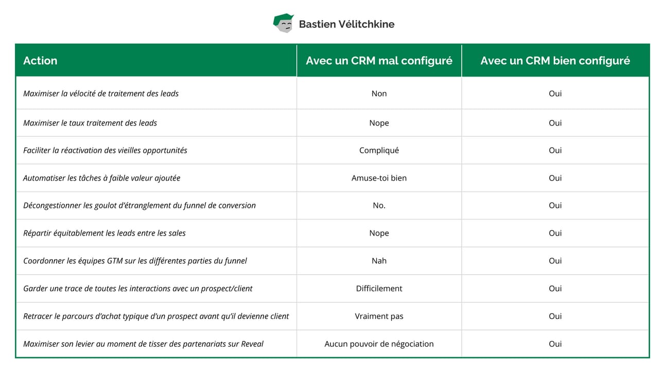 Cette newsletter n’est ni un guide pour choisir un CRM (où je finirais par te dire que le meilleur c’est celui pour lequel j’ai un lien d’affiliation 🌝) ; ni un guide de configuration technique.