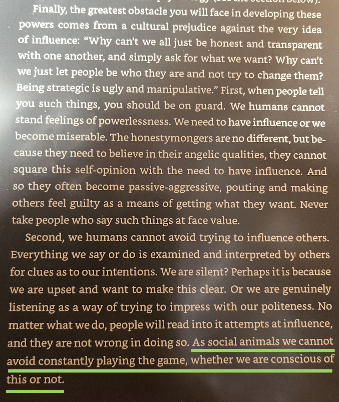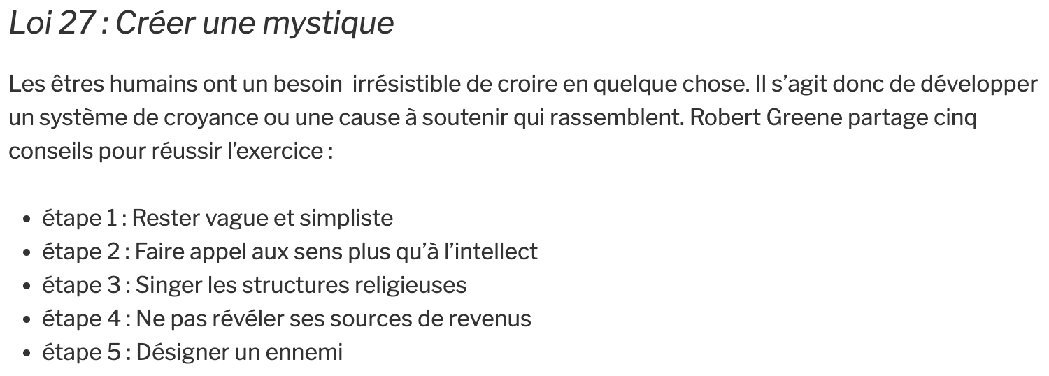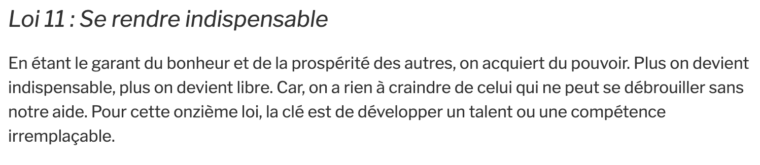 comme Robert Greene dans Laws of Human Nature, je pense qu’on ne peut pas échapper au “jeu” humain de l’influence — mieux vaut en maîtriser les règles, et les utiliser à bon escient, comme le couteau de ma métaphore du dessus.